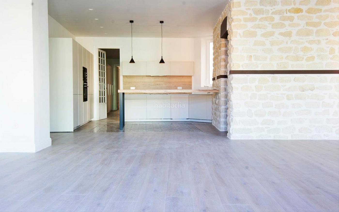 El pavimento combina tarima de madera con suelos hidráulicos recuperados, y en la zona del salón destacan las vigas de madera vistas y un muro estructural de piedra restaurado, detalles que conservan el alma original del edificio y le dan muchísimo encanto.