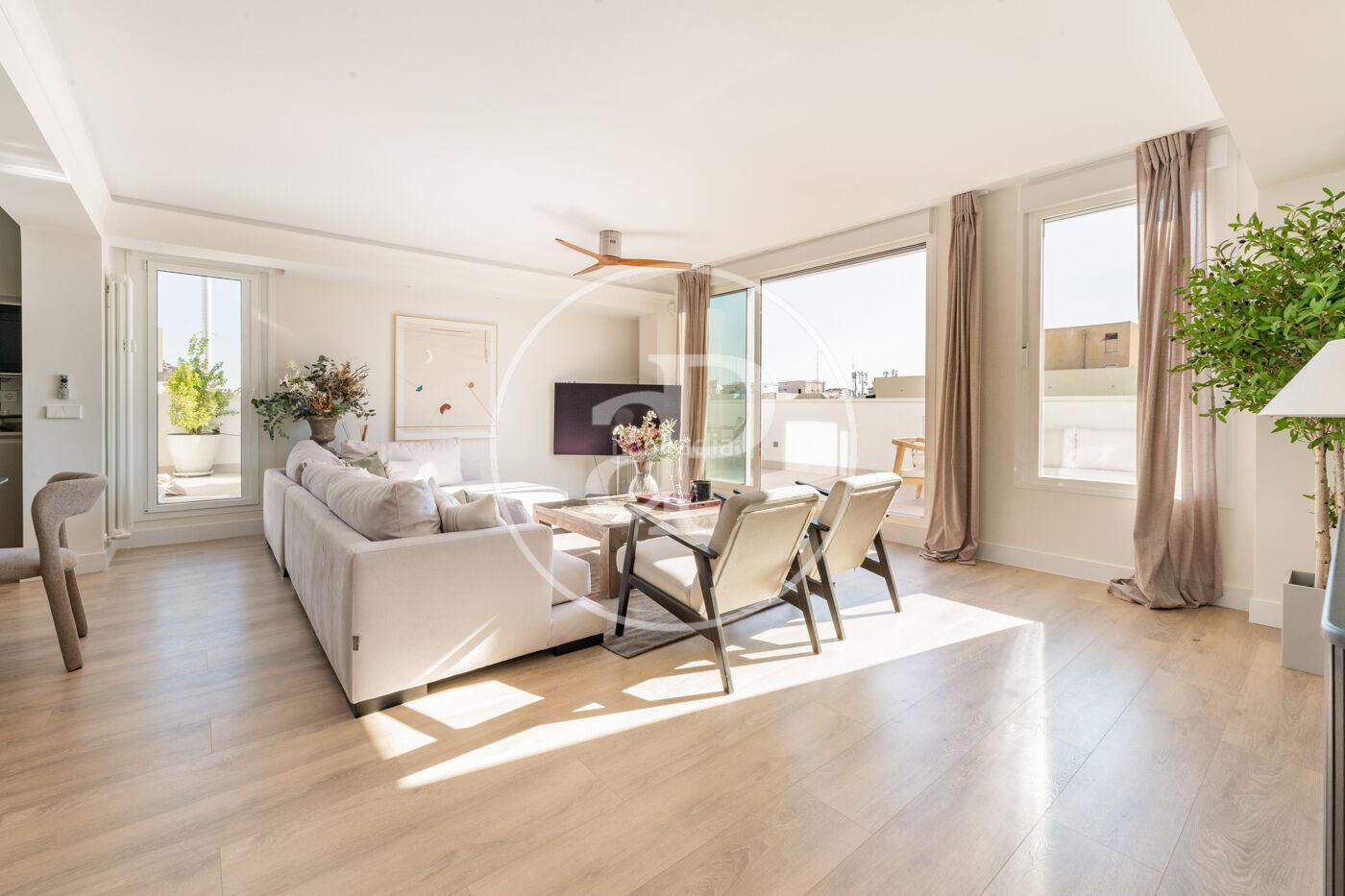 Este ático, situado en el exclusivo Barrio de Salamanca en Madrid, ofrece una distribución amplia y funcional, ideal para quienes valoran la comodidad y la privacidad. Cuenta con tres dormitorios, dos de ellos con baño en suite y vestidor, además de un aseo de cortesía.