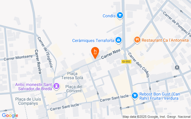 Casa de poble al centre de Breda, reformada completament. A la planta baixa: sala d'estar amb estufa de pèl·let, lavabo, menjador amb sortida al pati, cuina, gran espai de bugaderia i traster. A la primera planta: 2 habitacions dobles i un bany complet amb dutxa. A la 2a planta: 2 habitacions dobles i un bany complet amb dutxa. L'estufa de pèl·let té conductes d'aire calent fins a les habitacions de la primera planta. El pati és compartit amb la casa del costat.