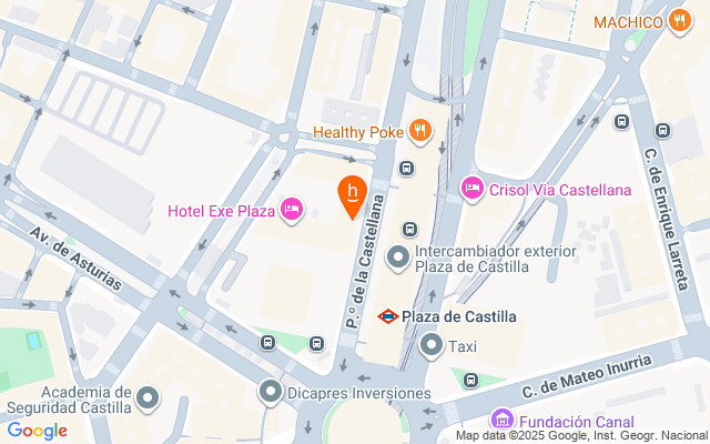 Situada en Plaza de castilla, barrio de Chamartín, es atravesada por el Pº de la Castellana, una de las principales arterias de la capital, y constituye el centro neurálgico del norte de la ciudad. Zona próxima al Estadio Santiago Bernabéu, AZCA (la zona empresarial por excelencia de Madrid), el Hospital de La Paz, y a la nueva zona de negocio del complejo Cuatro Torres Business Área.