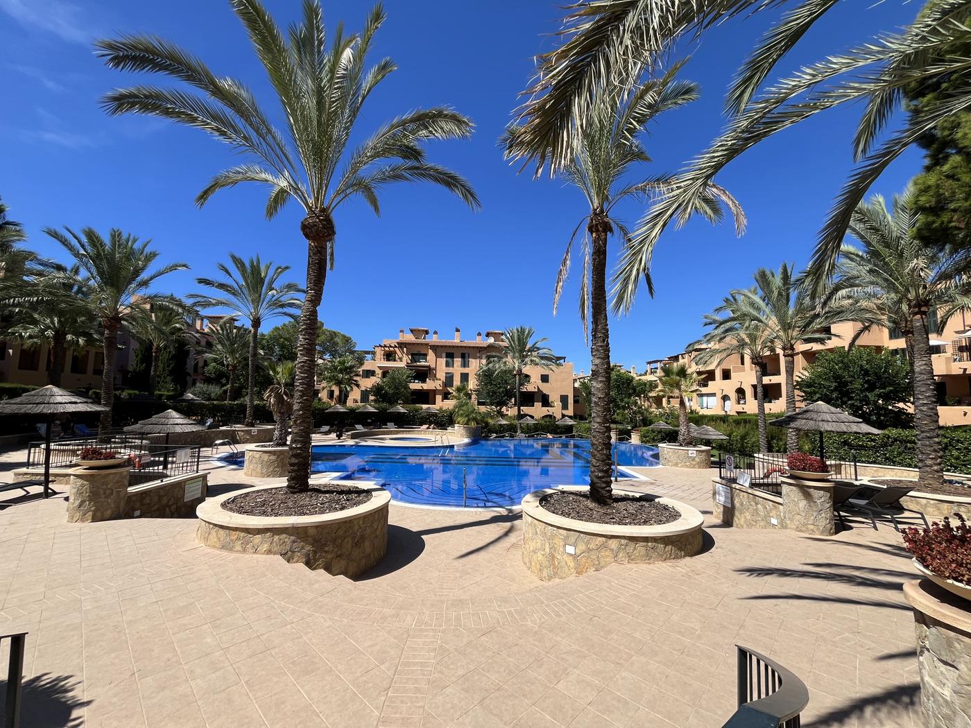 Precioso apartamento en planta baja en alquiler de corta temporada en la tranquila zona costera de Puig de Ros. El apartamento ofrece un salón amplio y luminoso con una cómoda zona de estar, comedor y TV de pantalla plana, dos acogedores dormitorios con camas dobles y acceso directo a una terraza y jardín privados, además de una cocina totalmente equipada y dos baños para mayor comodidad, uno de ellos en suite. Entre las comodidades modernas se incluyen aire acondicionado y una plaza de aparcamiento subterráneo. El apartamento forma parte de un residencial bien cuidado con una impresionante piscina comunitaria rodeada de palmeras, tumbonas y zonas de sombra, ideal para disfrutar del ambiente mediterráneo. Situado a poca distancia del mar y de los senderos costeros, así como de supermercados, restaurantes y tiendas, se encuentra a tan solo unos minutos en coche de Palma, el aeropuerto, campos de golf y hermosas playas. Perfecto para parejas o familias que buscan tanto relajación como una excelente base para explorar Mallorca. Disponible para alquileres de corta temporada con fechas flexibles – contáctenos para mas información y disponibilidad.