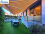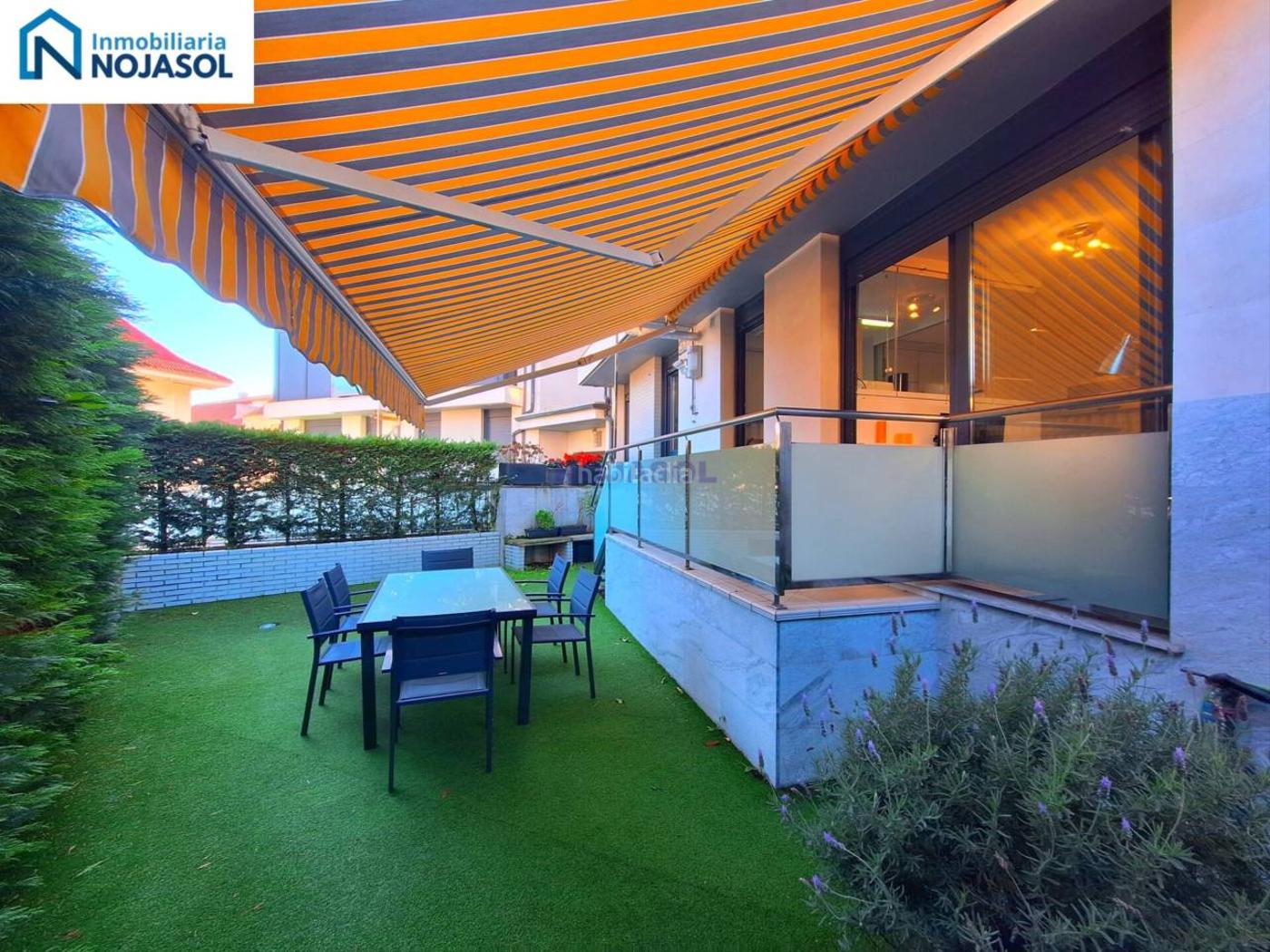 Un exclusivo y amplio jardín con césped artificial con orientación este (muy intimo), mesa de comer con sillas y un toldo que cubre la pequeña terraza y un trozo del jardín.