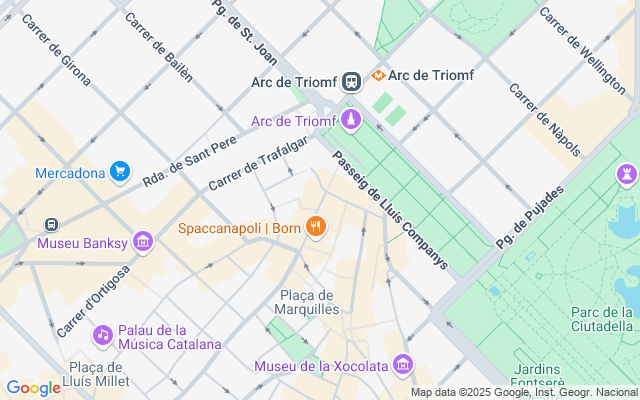 Ubicado en pleno centro histórico del Born, muy próximo al emblemático monumento del Arco del Triunfo y el Parque de la Ciudadela, solo 10 minutos andado de la playa Barceloneta y Villa Olímpica.
