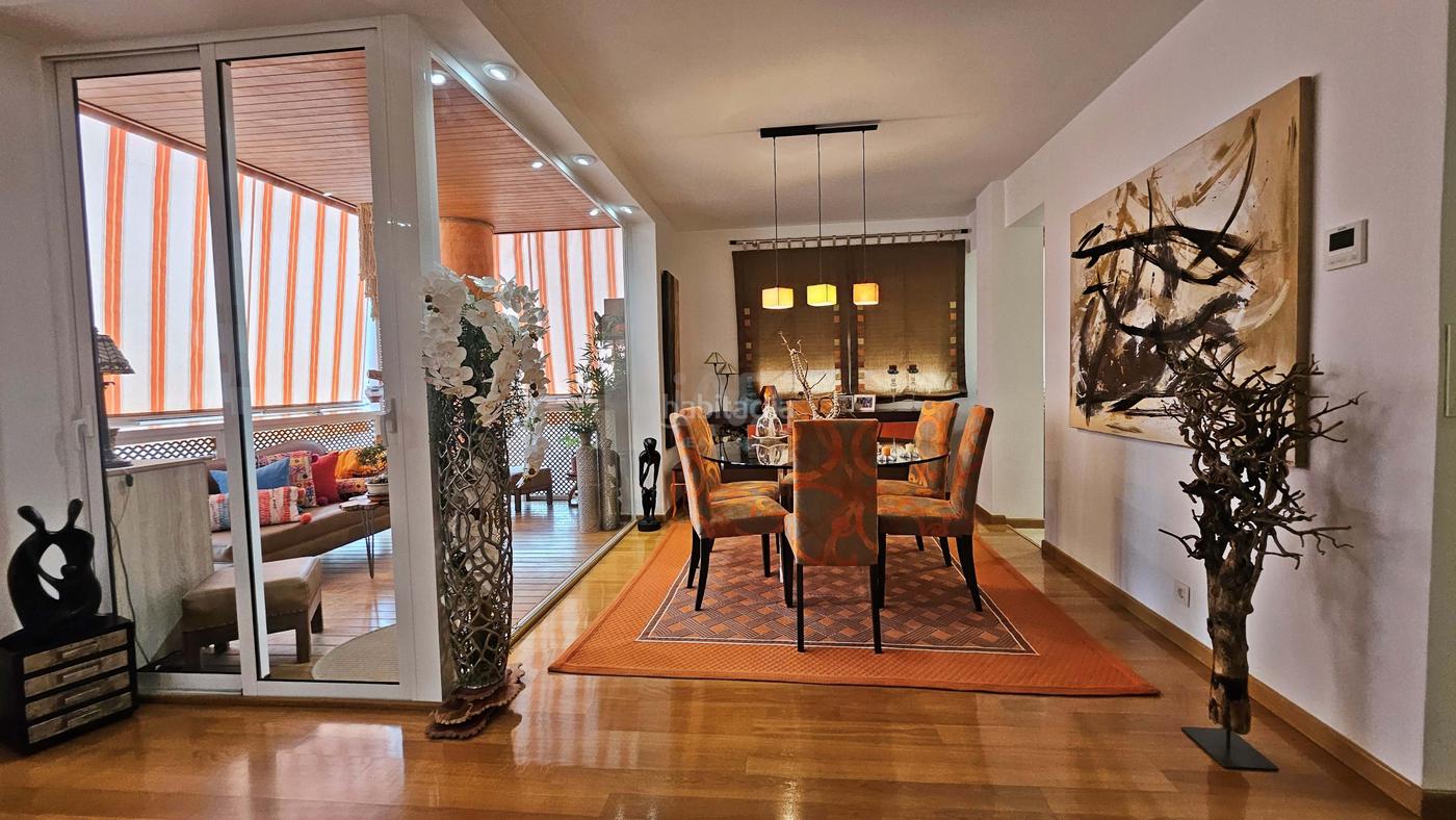 Al entrar, nos recibe un espacio lleno de luz y calidez, con suelo de parqué en la mayor parte de la vivienda. La cocina, semiabierta y moderna, cuenta con isla central perfecta para las comidas rapidas. Desde ella se accede tanto al comedor como al acogedor salón, decorado en tonos cálidos y con acceso a una terraza acristalada ideal para disfrutar todo el año.