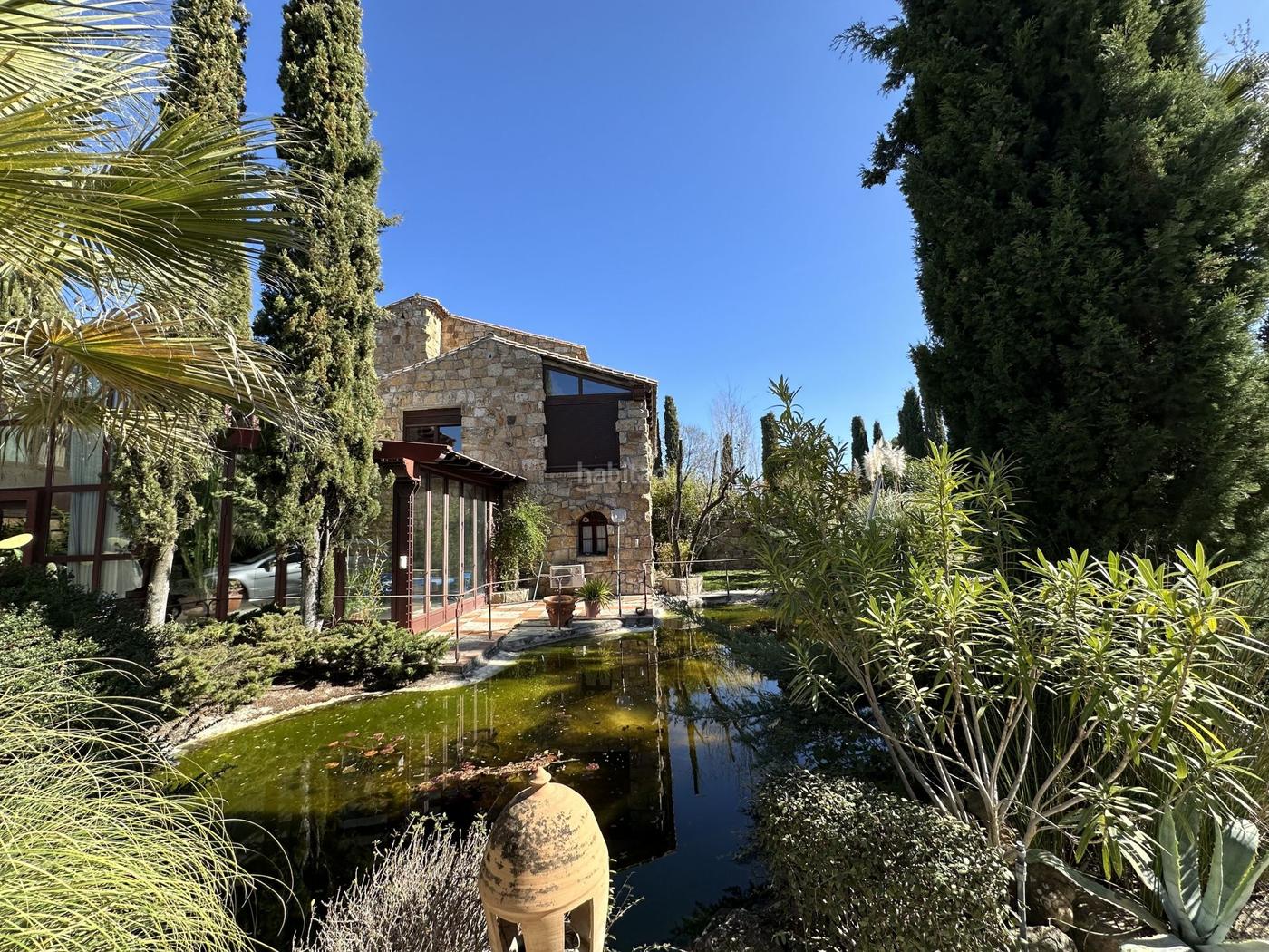 En el exterior tenemos un garaje pérgola para 4 plazas, más otro garaje de obra cerrado, piscina, un agradable estanque sobre excepcional jardín paisaje.