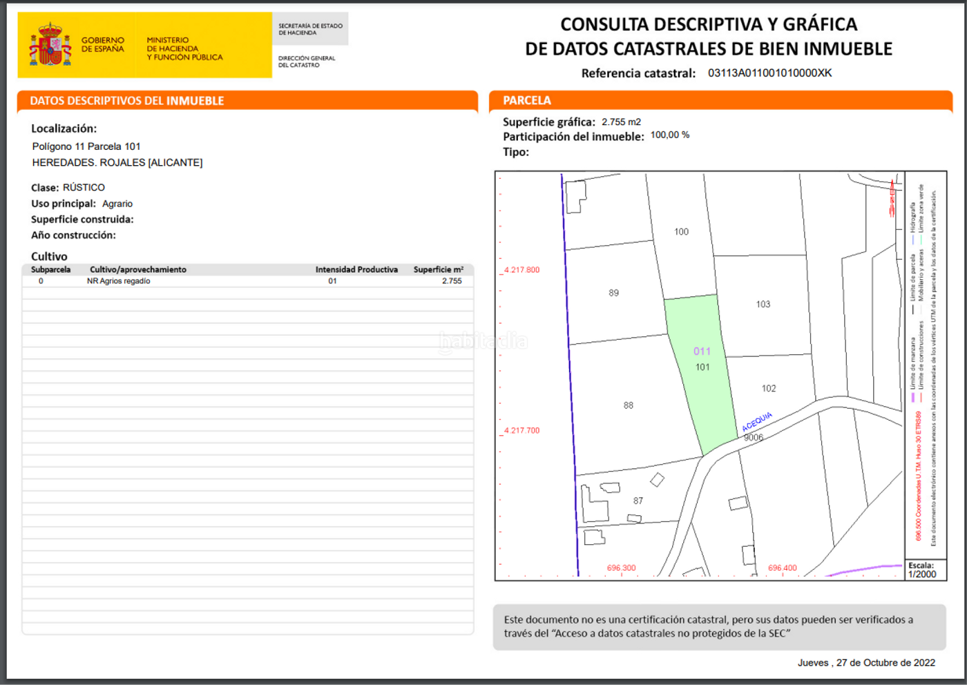 ¡Oportunidad única en Heredades, Rojales! Se venden dos extensos terrenos rústicos de 7403 m² Total (2.755 m2 uno + 4.648 m2 segundo) separados por una acequia, ideal para aquellos que buscan un espacio natural y tranquilo. Ubicados en Partida Heredades, este terreno ofrece fácil acceso desde la carretera a través de un camino de tierra. Aunque no es urbanizable, cuenta con agua de riego, lo que lo hace perfecto para proyectos agrícolas o de cultivo. Su ubicación en el núcleo urbano te permite disfrutar de la tranquilidad del campo sin renunciar a las comodidades de la ciudad. No dejes pasar esta ocasión de invertir en un entorno natural con gran potencial.