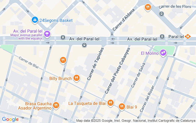 Se ubica en una zona con mucho movimiento peatonal, en la Calle Tapioles, transversal a Av Paral- lel, y calle Blai, vía casi obligada para ir al mercat de sant antoni por los habitantes del barrio, cercano al teatro Condal, bares, restaurantes, locales de ocio, teatros, bancos, supermercados, oficinas.. Al ser un local muy céntrico tiene muy buenas vías de comunicación y transporte publico, metro Paral lel, paradas de autobuses.