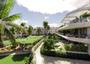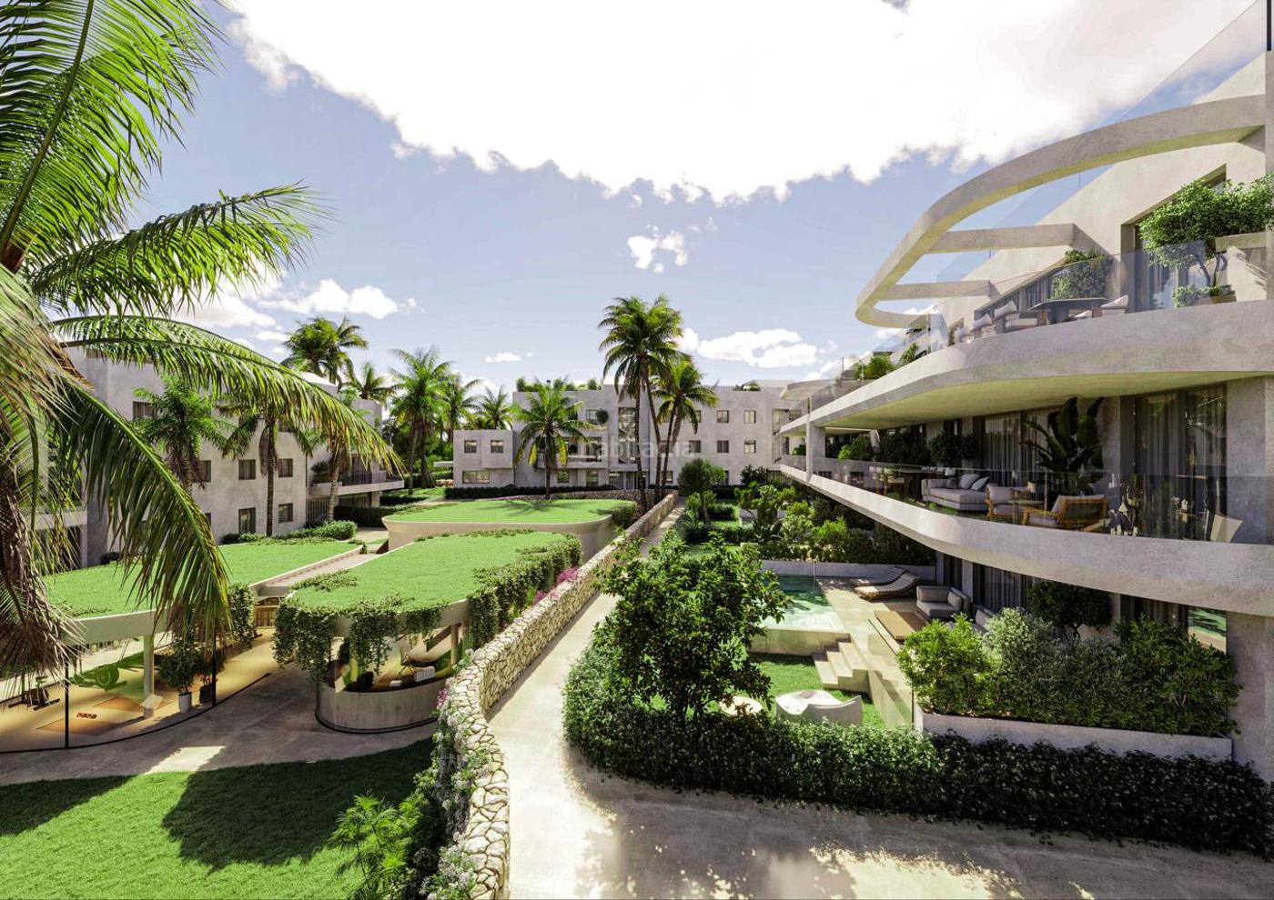 El apartamento cuenta con un amplio dormitorio con baño en suite, todo diseñado para maximizar la luz, el espacio y la comodidad. El salón principal adopta un concepto de planta abierta, combinando la cocina totalmente equipada, el comedor y el salón en un espacio social fluido. Grandes puertas correderas de cristal se abren directamente a la terraza cubierta, el jardín paisajístico y la piscina privada, creando una transición fluida entre la vida interior y exterior.