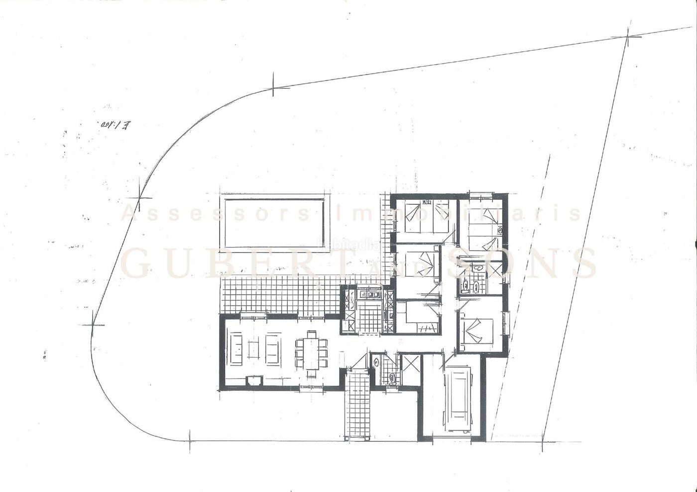 Se adjunta plano de planta que muestra una posible distribución moderna con piscina, terrazas, zonas ajardinadas y una distribución funcional con varias habitaciones, cocina americana, salón comedor y área exterior.