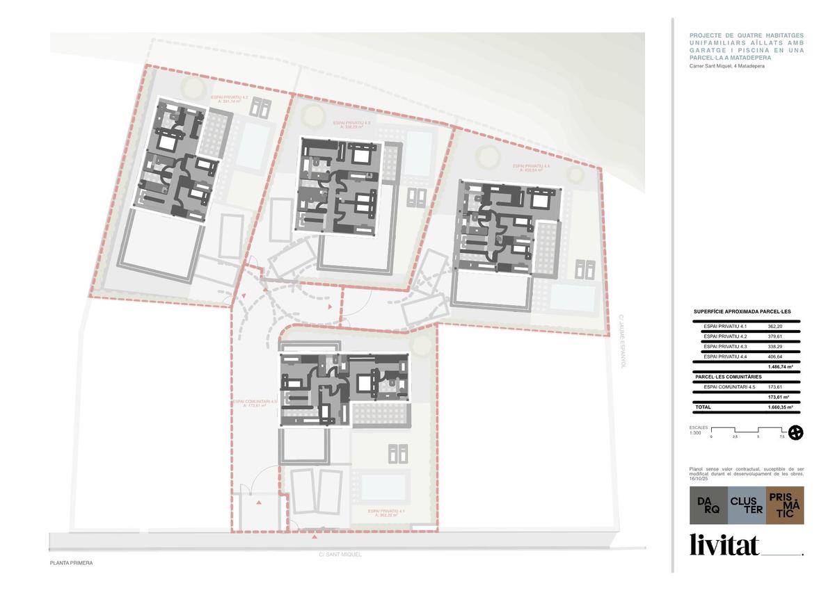 És un projecte de 4 cases situat, al meu criteri, en la millor zona de Matadepera: lluny del soroll del centre i de la carretera, envoltat d’arbres i tranquil·litat, però a només 2 minuts caminant de la plaça Sant Jordi i de les parades d’autobús. Un entorn privilegiat i còmode alhora.