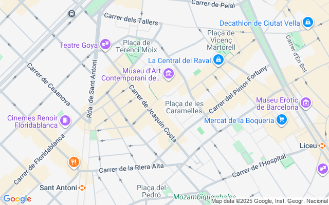 Ubicado en el corazón del animado barrio de El Raval, en el emblemático distrito de Ciutat Vella en Barcelona, este restaurante goza de una ubicación excepcional, a pocos pasos del mercado de la Boqueria y de la plaza Universitat. Esta localización estratégica, en el cruce de los flujos turísticos y locales, atrae diariamente a una clientela variada: visitantes internacionales, residentes y huéspedes de hoteles.